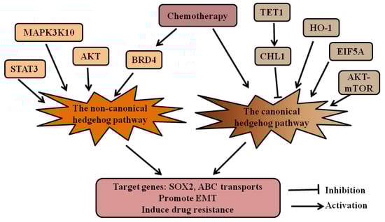 The HH pathway crosstalks with other signaling pathways in gastrointestinal cancers. The crosstalking of the canonical and non-canonical HH pathways with other pathways in drug resistance of gastrointestinal cancers are summarized. In gastrointestinal cancers, HO-1, ATK–mTOR, and EIF5A can activate the canonical HH pathway, while TET1 and CHL1 inhibit the canonical HH pathway. STAT3, MAP3K10, AKT, and BRD4 may activate the non-canonical HH pathway. Chemotherapy activates the HH pathway through different mechanisms. The active HH signaling increases expression of SOX2 and ABC transporters, promotes EMT, and induces drug resistance. Hedgehog (HH); heme oxygenase-1 (HO-1); mammalian target of rapamycin (mTOR); eukaryotic translation initiation factor 5A (EIF5A); signal transducer and activator of transcription 3 (STAT3); mitogen-activated protein kinase 10 (MAP3K10); bromodomain-containing protein 4(BRD4); ATP-binding cassette (ABC) transports; epithelial–mesenchymal transition (EMT).