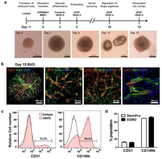 hiPSCs were dissociated into single cells using accutase with a 70-μm strainer (Falcon), and 2000 cells were distributed per well in 96-well ultra-low attachment plates (Corning) in E8 medium containing 5 μm Y-27632. The plate was spun down at 1500 rpm for 5 min and then incubated for 24 h. Aggregated cells were treated with 12 μm CHIR99021 (Tocris, Bristol, UK) and 30 ng/mL BMP4 (Peprotech, Rocky Hill, NJ, USA) on days 0–2, and the medium was switched to that containing 100 ng/mL VEGF-A (Peprotech, Rocky Hill, NJ, USA) and 30 ng/mL forskolin (Stemgent) on days 3–5. On day 5, cell aggregates were embedded in a 1:2 Matrigel (Corning, 356231): collagen I (Advanced BioMatrix) solution and treated with StemPro34 (Gibco) containing 5% inactivated FBS (Thermo Fisher, Waltham, MA, USA), 100 ng/mL VEGF-A, and 100 ng/mL FGF-2 (R&D systems, Minneapolis, MN, USA). On day 7 or 8, ECs sprouted from the aggregates, and vascular networks were established. On day 10, individual BVOs were isolated from the gel and maintained in 96-well ultra-low attachment plates until day 15.