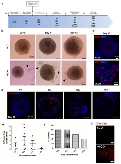 Generation of vascularized cerebral organoids. (a) Schematic diagram of the procedure used to generate vascularized cerebral organoids. (b) Blood vessel clumps (black arrowheads) fused to neural organoids generated on day 5 in the co-culture of developing cerebral organoids. (c) CD31+ endothelial cells were observed on day 13 of vhCO development. (d) CD31+ endothelial networks generated under different FBS conditions. (f) The percentage of organoids succeed to generate vessels after co-culture in different FBS concentrations. (e) Quantification of vessels performed using AngioTool. Data are plotted as means ± standard deviation. ** p < 0.01; one-way ANOVA. (g) Dextran was perfused on vhCO. (f) Ratios of successful vascularization under various FBS concentrations.