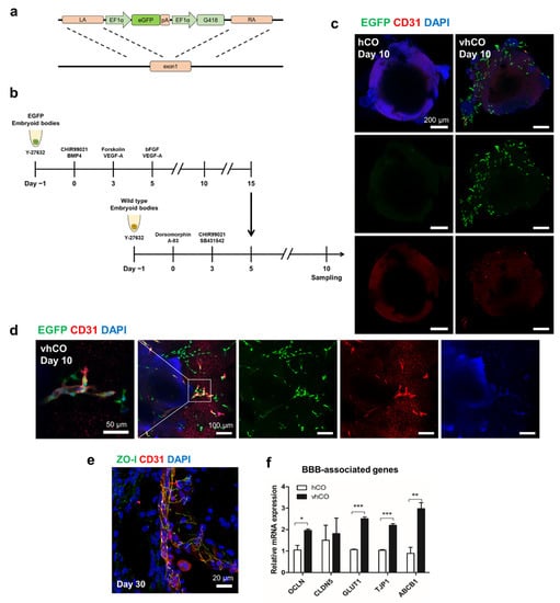 Characterization of blood-brain barrier-like structures in vhCOs. (a) The EGFP transgene template used to generate cells overexpressing EGFP. (b) EGFP-expressing blood vessel organoids co-cultured with wild-type cerebral organoids. (c) A few EGFP+ cells expressed the CD31+ endothelial marker in the vhCOs. (d) In magnificent images, CD31-expressing cells co-localized with EGFP+ cells. (e) ZO-I+ tight junction proteins detected between endothelial cells. (f) Expression of blood–brain barrier markers (occludin, claudin-5, glucose transporter1, ABCB1 and tight junction protein1) detected by RT-qPCR. Day 15 BVOs, day 18 hCOs, and day 18 vhCOs were analyzed (n = 8). * p < 0.05, ** p < 0.01, *** p < 0.001; unpaired, two-tailed student’s t-test. (g) GFAP+ astrocyte-like cells were non-covered CD31+ endothelial tubes.