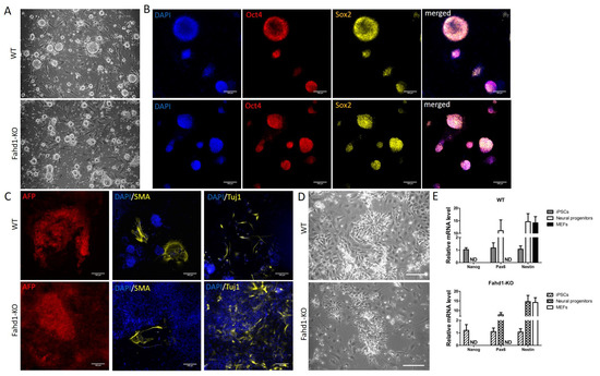 We next analyzed the pluripotency status of the selected clones. Both KO and WT iPSCs showed typical round stem cell colonies when cultured in vitro on the feeder layer (Figure 2A). Immunocytochemistry showed that they both co-expressed the pluripotency markers Oct4 and Sox2 (Figure 2B). Germ layer differentiation also confirmed the ability of KO and WT iPSCs to differentiate into the three germ layers, as indicated by the expression of the endodermal marker AFP, the mesodermal marker SMA, and the ectodermal marker Tuj1 (Figure 2C). The most common pluripotency markers Nanog, Oct4, and Sox2 were similarly expressed in iPSCs of either genotype (Figure 2B,E). To compare cell fate decisions, we differentiated the iPSCs toward a neural fate [10]. KO-Fahd1 and WT iPSCs formed in vitro the typical neural rosettes morphology during neural specification, and they both displayed an increased expression of the neural progenitor markers Pax6 and Nestin with a downregulation of the pluripotency marker Oct4 (Figure 2D,E). As expected, expression of Fahd1 was not detectable in any of the Fahd1-KO cell types, and this was also confirmed by Western blot analysis (Supplementary Figure S2C,D). Together, these findings suggest that Fahd1 deficiency does not grossly affect the differentiation of iPSCs to neural progenitor cells.