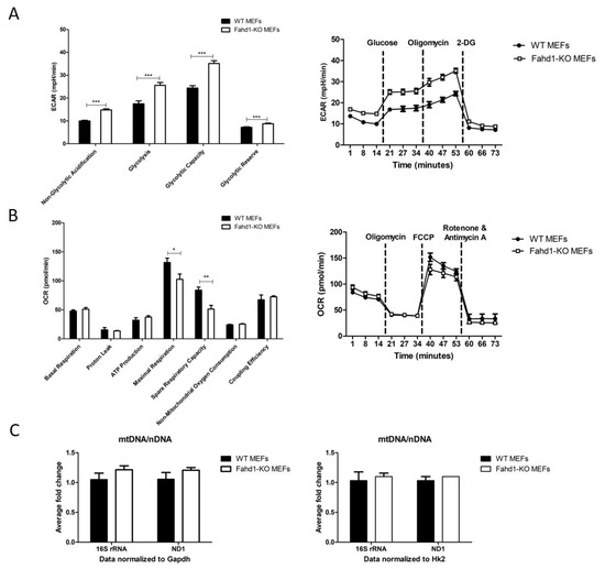 Increased glycolysis in Fahd1-KO MEFs. (A) ECAR measurements in mpH/min/cell using Seahorse XFp analyzer and following glycolysis stress test protocol showed a highly significant increase in basal glycolysis, glycolytic capacity, non-glycolytic acidification, and glycolytic reserve in Fahd1-KO MEFs as compared to WT, *** p < 0.001, n = 6. (B) OCR measurements in pmol/min/cell using Seahorse XFp analyzer and following MitoStress test protocol showed a trend to decreased OCR in Fahd1-KO vs. WT MEFs, whereas maximal respiration and spare respiratory capacity parameters were significantly decreased in Fahd1-KO, * p < 0.05, ** p < 0.01, n = 3. (C) Average fold-change of mtDNA/nDNA ratio showing the expression of the mt genes 16S rRNA and ND1 as normalized to two housekeeping genes Gapdh and Hk2. The DNA copy number of these genes was determined in WT and Fahd1-KO MEFs. No significant difference was observed, n = 6. MEFs: mouse embryonic fibroblasts, iPSCs: induced pluripotent stem cells, WT: wild type, KO: knock-out, ECAR: extra cellular acidification rate, OCR: oxygen consumption rate, mt: mitochondrial, n: nuclear.