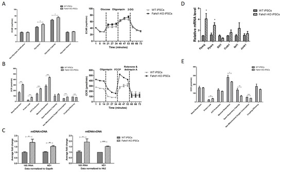 We also determined glycolytic activity in iPSCs derived from Fahd1-KO and WT MEFs, using the glycolysis stress assay. It is well established that reprogramming of somatic cells to iPSCs involves a significant increase of glycolytic activity [2]. As expected, reprogramming of WT MEFs increased ECAR due to glycolytic activity from 17.5 ± 1.3 mpH/min/cell (Figure 3A) to 45.1 ± 2.1 mpH/min/cell in the resulting iPSCs (Figure 4A); similarly, reprogramming of Fahd1-KO MEFs increased ECAR due to glycolytic activity from 25.6 ± 1.2 mpH/min/cell (Figure 3A) to 53.5 ± 2.3 mpH/min/cell in the resulting iPSCs (Figure 4A), which was still significantly higher compared to the iPSCs derived from WT MEFs.