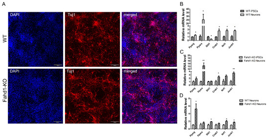 Whereas reprogramming of somatic cells to iPSCs demands the transition from mitochondrial oxidative phosphorylation to glycolysis, differentiation of iPSCs involves additional remodeling of the mitochondrial network for increased mitochondrial activity [19]. It is known that the transition from neural stem cells (NSC) to a neuronal lineage is accompanied by increased mitochondrial biogenesis, as well as the downregulation of glycolysis and fatty acid oxidation pathways [20]. For instance, the progression from pluripotent progenitor cells to neurons is characterized by a strong reduction in glycolysis-related proteins, such as hexokinase 2 (HK2) and isoform A of lactate dehydrogenase (LDHA), which metabolizes the reduction of pyruvate to lactate. Additionally, a switch from PKM2 to its constitutively active isoform PKM1 and an upregulation of OXPHOS-related genes has been observed [21,22]. When we differentiated WT and Fahd1-KO iPSCs to neurons, we observed an efficient neuronal differentiation in both genotypes as indicated by the expression of the neuronal marker Tuj1 (Figure 5A). We analyzed the mRNA expression of Fahd1 in MEFs, iPSCs, and neurons only in WT, since the mRNA expression of Fahd1 in KO was not detected. As compared to MEFs, we observed a downregulation of Fahd1 mRNA expression in iPSCs and an increase in differentiation to neurons (Supplementary Figure S2C). This dynamic Fahd1 expression indicated its important role in the processes we investigated. When we analyzed the relative mRNA expression of six genes (Pparg, Ppara, Slit1, Creb1, Nrf1, and Junk1) which are known to be involved in mitochondrial biogenesis [18], we found consistent upregulation of five of these genes during neuronal differentiation, irrespective of the genotype (Figure 5B,C). Nevertheless, mRNA levels of several of these genes, including Pparg, Ppara, Slit1, Nrf1, and JNK1 were higher in Fahd1-deficient neurons relative to WT, suggesting that increased mitochondrial biogenesis continues in these cells after differentiation from iPSCs to neurons (Figure 5D). These results support the conclusion that the higher degree of mitochondrial biogenesis in Fahd1-KO relative to WT cells is maintained throughout neuronal differentiation, probably compensating for mild mitochondrial dysfunction in neurons derived from Fahd1-deficient cells.