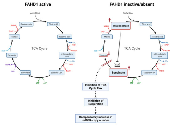To conclude, according to our hypothesis and supported by published and unpublished experimental data, the current view is that Fahd1-KO leads to a decreased activity of complex II of the mitochondrial electron transport chain, resulting from accumulation of oxaloacetate (OAA) which is a competitive inhibitor of succinate dehydrogenase (SDH) [9] (Figure 6). This results in the accumulation of succinate, reduced levels of fumarate, and reduced flux through the TCA cycle, together leading to an impaired mitochondrial function, the extent of which differs between cell types. Severe mitochondrial dysfunction due to FAHD1 deficiency will be compensated for by increased mtDNA copy number (Figure 6).