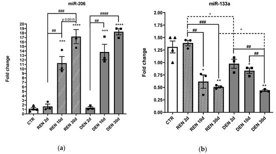 Muscle expression of miR-206 and miR-133a during muscle denervation and re-innervation. RT-PCR of (a) miR-206, (b) miR-133a in re-innervating (REN) and chronic denervated gastrocnemius muscles (DEN), 2 days (2d), 10 days (10 d) and 30 days (30 d) after sciatic nerve resection (* comparison vs. control: (* p < 0.05, ** p < 0.005, *** p < 0.0005, **** p < 0.0001. ^ and # comparison between groups ^ p < 0.05, ## p < 0.005, ### p < 0.0005, #### p < 0.0001. •, ▲, ■ represent samples in control, re-innervating and denervated groups).
