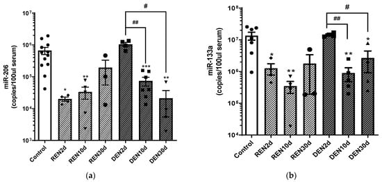 Serum levels of miR-206 and miR-133a during muscle denervation and re-innervation. Absolute quantification of miR-206 (a) and miR-133a (b) serum levels in re-innervating (REN) and denervated (DEN) gastrocnemius muscles, 2 days (2 d), 10 days (10 d) and 30 days (30 d) after sciatic nerve resection (* comparison vs. control: * p < 0.05, ** p < 0.005, *** p < 0.0005. # comparison between groups: # p < 0.05, ## p < 0.005. •, ▲, ▼, ◆, ■, represent samples in control, re-innervating and denervated groups).