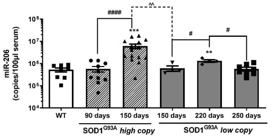 Serum levels of mir-206 are differently modulated during ALS disease progression. Absolute quantification of miR-206 levels in SOD1G93A high-copy and SOD1G93A low-copy mice at different stages of the disease (* comparison vs. control: ** p < 0.005, *** p < 0.0005. ^ and # comparison between groups: ^^ p < 0.005, # p < 0.05, #### p < 0.0001. •, ▲, ▼, ◆, ■, represent samples of WT control mice, and SOD1G93A high-copy and SOD1G93A low-copy mice at different stages of the disease).