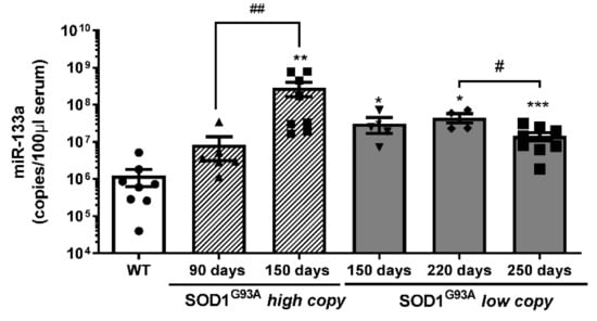 Serum levels of mir-133a are differently modulated during ALS disease progression. Absolute quantification of miR-133a levels in SOD1G93A high-copy and SOD1G93A low-copy mice at different stages of the disease (* comparison vs. control: * p < 0.05, ** p < 0.005, *** p < 0.0005. # comparison between groups: # p < 0.05, ## p < 0.005. •, ▲, ▼, ◆, ■, represent samples of WT control mice, and SOD1G93A high-copy and SOD1G93A low-copy mice at different stages of the disease).