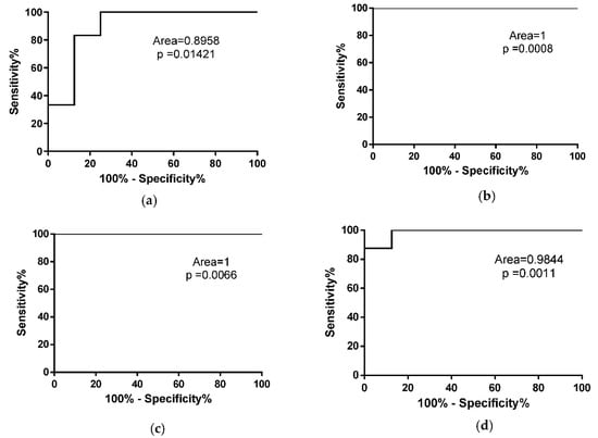 To evaluate whether the number of copies of miR-133a could discriminate fast from slow progressing ALS mice from control mice, we performed a ROC analysis of miRNA levels in SOD1G93A high-copy and low-copy mice. As described in Figure 6, miR-133a represents a good biomarker for both fast and slow progressive ALS mice at the onset and end stages of SOD1G93A high-copy mice (Figure 6a,b) and at the late and end stages of the disease in SOD1G93A low-copy mice (Figure 6c,d).