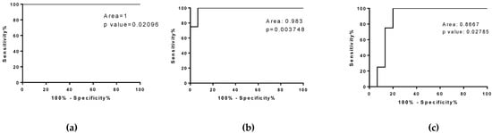 Therefore, in order to identify the threshold value of miR-206 that could discriminate the restoration of physiological communication between muscles and nerves from those associated with ALS disease, we performed a ROC curve analysis of the miR-206 levels of wild type re-innervating mice and fast and slow progressive ALS mice. The analysis provided a cut-off <161,000 for REN 30D vs. SOD1G93A low-copy and a cut-off <689,500 REN 30D vs. SOD1G93A high-copy mice (Figure 7a,b). Moreover, the ROC curve analysis revealed that miR-206 levels represent a good biomarker to discriminate fast progressive ALS mice from slow progressive mice (Figure 7c).