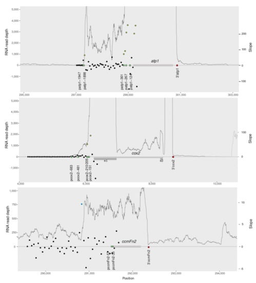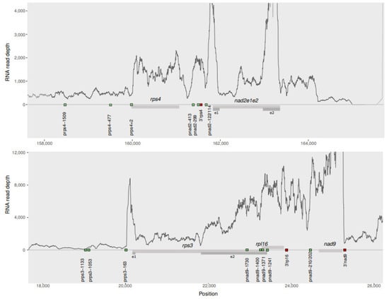 - Giegé, P.; Brennicke, A. RNA editing in Arabidopsis mitochondria effects 441 C to U changes in ORFs. Proc. Natl. Acad. Sci. USA 1999, 96, 15324–15329. [Google Scholar] [CrossRef]