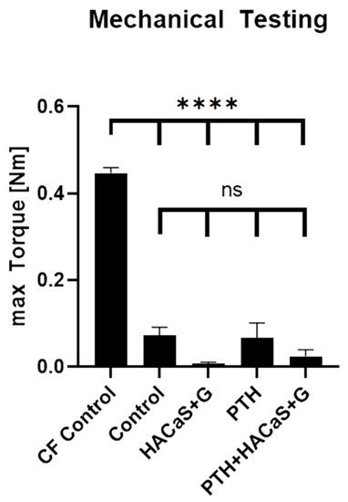 Mechanical testing. The max. torque of the contralateral intact femora (CF control) is significantly higher than all other groups, but there are no significant differences between the control and the treatment groups (PTH, HACaS+G and PTH+HACaS+G). **** = p < 0.0001, ns = not significant.