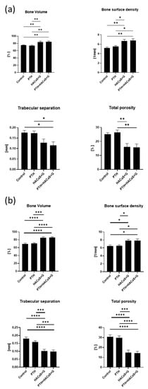 3D Analysis of bone tissue: (a) 4 weeks after the second surgery and (b) 8 weeks after the second surgery. * = p < 0.05, ** = p < 0.01, *** = p < 0.001, **** = p < 0.0001, ns = not significant.