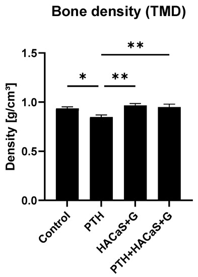 Analysis of bone density (TMD). PTH-treated samples showed less density in comparison to the other groups. * = p < 0.05, ** = p < 0.01.