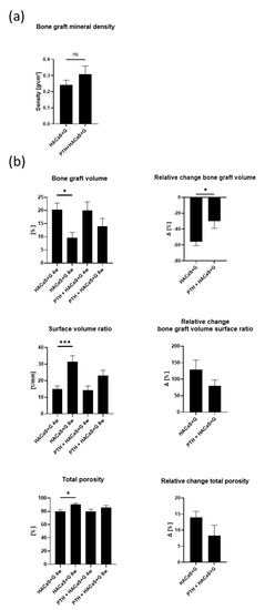 Analysis of bone graft substitute via µCT: (a) comparison of bone graft mineral density 8 weeks after insertion between HACaS+G and PTH+HACaS+G, and (b) comparison of 3D analysis of bone graft substitute 4 and 8 weeks after insertion. * = p < 0.05, *** = p < 0.001, ns = not significant.