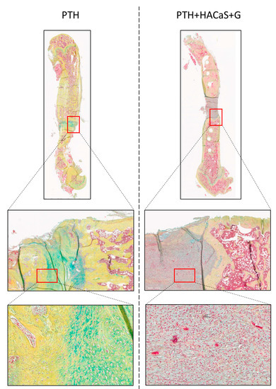 Remarkably, PTH administration caused a dramatic increase in CD31+ cells and thus supported vascularization in the defect. This was the case in both PTH mono treatment as well as in combination with HACaS+G.