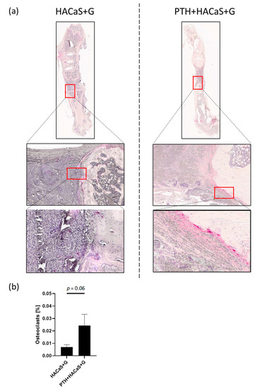TRAP staining shows invasion of osteoclasts in HACaS+G: (a) TRAP staining (osteoclasts with red staining), and (b) quantification.