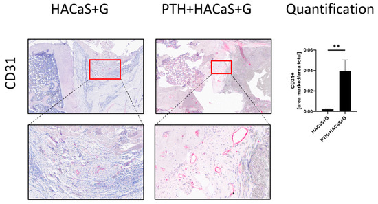 The endothelial cell marker CD31 was used to quantify vascularization in the defect. Strikingly, when comparing the HACaS+G group treated with PTH and the PTH+HACaS+G group, the amount of CD31+ cells was significantly increased in the PTH group (Figure 8).