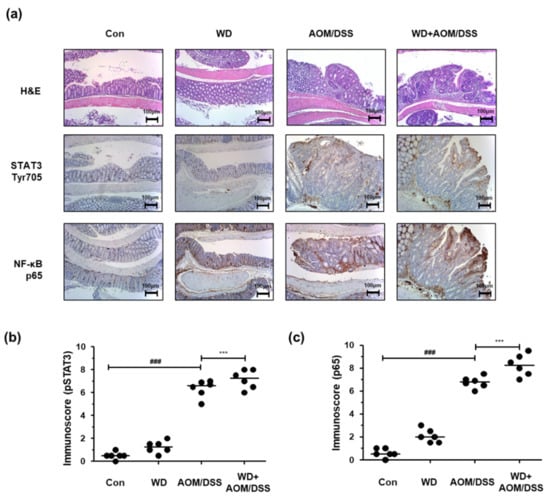 Effect of WD consumption on protein expression of NF-κB and STAT3 in an AOM/DSS-induced CAC mouse model. (a) Colon tissue sections from each group stained by H&E and for NF-κB p65 and STAT3 Tyr705 (original magnification, 100×); (b) immunoscores for STAT3 Tyr705; (c) immunoscores for NF-κB p65. The values are the means ± SD (n = 6); ### p < 0.001 when compared to Con; *** p < 0.001 when compared to AOM/DSS.