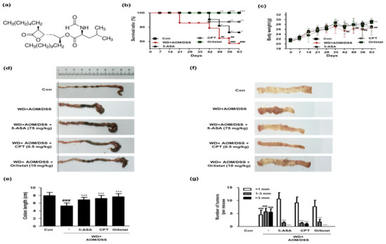 In this study, we estimated the therapeutic effects of orlistat (structure shown in Figure 3a) on WD-driven CAC mice. As shown in Figure 3b, the WD + AOM/DSS group had a low survival ratio, whereas treatment with ASA, CPT, and orlistat significantly increased the survival rate of the WD-driven CAC mice. In the WD + AOM/DSS group, body weights were also significantly reduced compared to those in the Con group. However, only the orlistat treatment normalized the body weight in WD-driven CAC mice (Figure 3c). Likewise, the colon length was shorter in the WD + AOM/DSS group than in the Con group. However, treatment with ASA, CPT, and orlistat significantly increased the colon length (Figure 3d,e). Figure 3f,g shows that tumor multiplicity was significantly increased by WD feeding in the AOM/DSS mouse model, whereas treatment with ASA, CPT, and orlistat significantly reduced the number of tumors in WD-driven CAC mice.