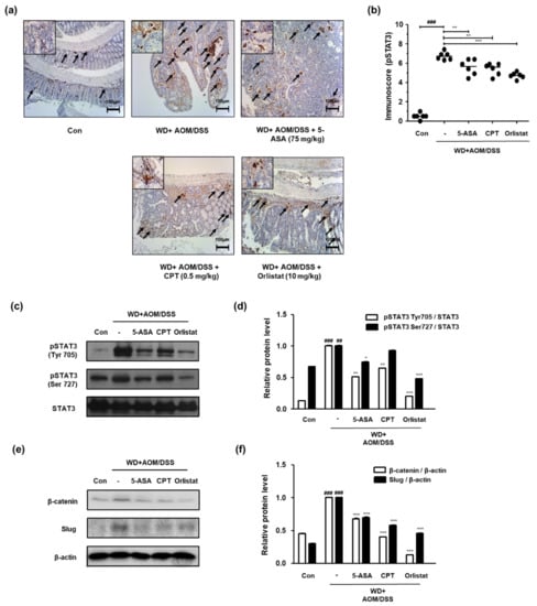 We confirmed the phosphorylation of STAT3 and the protein expression of STAT3 and STAT3-related genes in order to probe the effects of orlistat on the STAT3 signaling pathway in WD-driven CAC mice. Figure 5 shows that the expression of p-STAT3 Tyr 705 was significantly upregulated, whereas treatment with ASA, CPT, and orlistat significantly downregulated it in WD-driven CAC mice. We also found that the phosphorylation of STAT3 at the Tyr705 and Ser727 residues had increased in the WD + AOM/DSS group, but treatment with orlistat significantly repressed phosphorylation at these residues (Figure 5c,d). Similarly, the WD + AOM/DSS group showed less overexpression of β-catenin and slug protein expression, which is related to epithelial–mesenchymal transition (EMT) signaling. However, treatment with ASA, CPT, and orlistat significantly suppressed STAT3 and EMT-related protein expression (Figure 5e,f).
