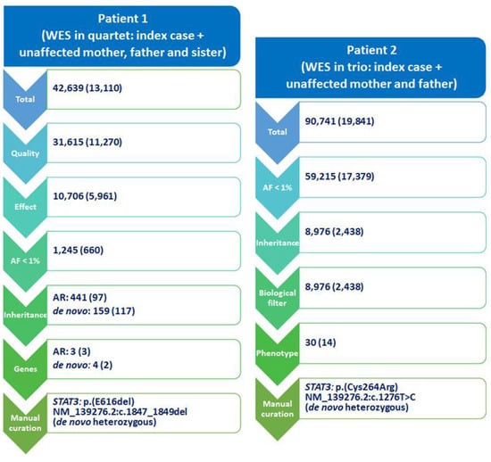 Different filtering strategies applied to WES data analysis. Number of variants obtained in each filtering step is indicated, with the number of genes in parentheses. The sequential filtering strategy which led to the prioritization of probably pathogenic candidate variants, to explain the patients’ phenotype of severe short stature associated with immune dysregulation, was different for each case. For patient 1, variants considered fulfilled the following criteria: adequate quality, an effect on the protein (either located in coding region: nonsense, missense, in-frame deletions or insertions, and frameshift variants), allelic frequency (AF) < 1% in the general population (according to ExAC), consistent with the presumed inheritance pattern (either autosomal recessive (AR) with two variants in different alleles of the same gene or de novo variant were suspected, since her parents and sister were unaffected), and variants included in a 250-candidate gene list. For patient 2, filtering criteria for variants present in the trio included: AF < 1%, AR or de novo inheritance pattern, a biological filter (genes related to lymphocyte activation), and phenotype (eczema, colitis, autoimmune thyroiditis, autoinflammatory disorders). For both cases, a final step of manual curation of several variants was required to select the prioritized STAT3 variant.