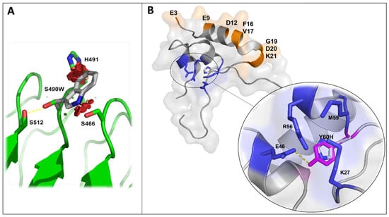 In our own experience, the association between the in silico approach and in vitro experimentation has been rather evidenced by several previous studies. A widely used software for molecular visualization and in silico modeling is PyMOL (PyMOL Molecular Graphics System, Version 1.8.4.0, Schrödinger, LLC, http://www.pymol.org/, accessed on 15 July 2021). The PyMOL program was used for in silico structural analysis of eleven IGFALS variants identified in short-statured children [60], two activating STAT3 variants in two patients with short stature and immune dysregulation [41], one homozygous variant in IGF1 in a patient with short stature and bilateral sensorineural deafness [61], and a heterozygous STAT5B variant in a patient with short stature [62]. Of these, 3D structural analysis of the substitution context has been especially helpful for those variants where bioinformatic prediction software yields inconsistent results, with classifications ranging from pathogenic to benign. For example, p.S490W-ALS was predicted as a pathogenic variant by two out of four pathogenicity prediction tools [60]. However, in silico structural analysis showed that a serine to tryptophan substitution would have an overall structural destabilizing effect due to the loss of the hydrogen bond with Ser512 and the introduction of the tryptophan large bulky aromatic side chain that clashes with surrounding residues (Figure 3A). In vitro functional experiments supported the impact of this mutation on protein folding, since this variant was absent in lysates and cell media, suggesting it is intracellularly degraded as a consequence of an aberrant non-native conformation [60].