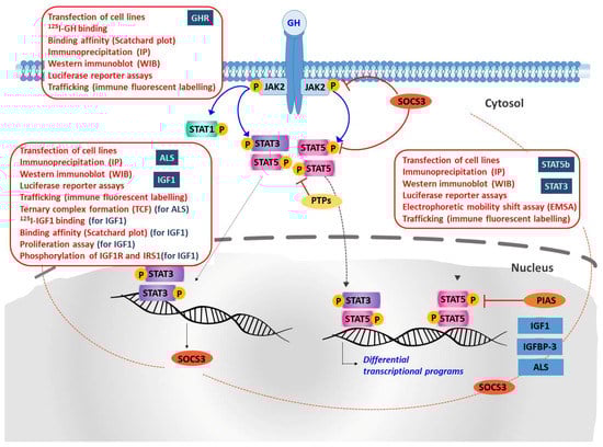 Schematic representation of GH action and the methodological tools applied to the characterization of genetic variants identified in different molecular players. Upon GH binding to dimerized cell-surface GH receptor (GHR), JAK2 is activated and phosphorylates specific tyrosine residues in the intracellular domain of the receptor. STAT proteins bind to these phosphotyrosine motifs through their SH2 domain, become phosphorylated (STAT-P), form homo and heterodimers, and translocate to the nucleus. In the nucleus, STATs dimers bind to specific promoter elements and regulate gene expression. Expression of insulin-like growth factor-1 (IGF1), insulin-like growth factor binding protein-3 (IGFBP-3), and acid-labile subunit (ALS) are upregulated by STAT5 homodimers. Negative regulation of STATs activation is mediated by SOCS (suppressors of cytokine signaling), PIAS (protein inhibitors of activated STATs) and PTPs (protein tyrosine phosphatases).