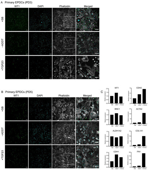 Primary human EPDCs undergo EMT and show a mesenchymal phenotype upon TGFβ3 stimulation. (A) Immunostaining showing that SB-treated primary human EPDCs of PD3 display a typical cuboidal epithelial morphology (indicated by phalloidin staining) and nuclear WT1 expression. TGFβ3-treated primary EPDCs undergo EMT, acquire a spindle-like appearance, which is accompanied by a large decrease in the percentage of WT1-positive cells. Culture without SB or TGFβ3 causes a small fraction of PD3 EPDCs to lose their cuboidal morphology and nuclear WT1 expression. (B) Immunofluorescent staining of primary human EPDCs of PD5 subjected to the same treatments as in (A) Irrespective of the specific culture conditions, primary human EPDCs of PD5 show a low percentage of WT1-positive cells and display signs of EMT. (C) Assessment by RT-qPCR of epithelial and mesenchymal marker gene expression in primary human EPDCs of PD5 cultured under different conditions. Technical replicates: 3, biological replicates: 1. Scale bar = 100 µm. −ADDT = no additive.