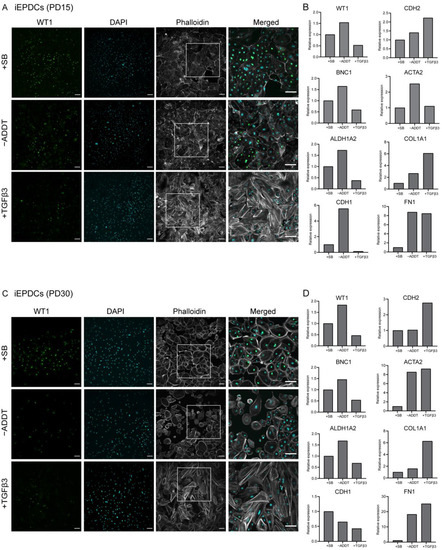 To study the ability of iEPDCs to undergo EMT, we exposed iEPDCs of PD15 and -30 to Dox-free medium without additives (control conditions) or supplemented with either SB or TGFβ3 for five days and compared the cell morphology and the protein level of the epithelial marker WT1 with those of similarly treated primary EPDCs of PD3 and -5. To eliminate the possible effects of residual LT expression, Dox was removed from the iEPDC culture medium 4–8 days before SB or TGFβ3 supplementation. As expected, the primary EPDCs and iEPDCs displayed a cuboidal cell morphology and higher WT1 protein expression in the presence of SB than under control conditions (Figure 2A,B and Figure 3A,C). After culturing for five days in the absence of SB, neither primary EPDCs nor iEPDCs showed morphological signs of EMT (Figure 2A,B and Figure 3A,C). Upon TGFβ3 stimulation, both primary EPDCs and iEPDCs transformed into spindle-shaped mesenchymal cells and showed redistribution of F-actin as assessed by phalloidin staining from the cortical cytoskeleton to stress fibers, which is indicative of the occurrence of EMT (Figure 2A,B and Figure 3A,C). EMT was further confirmed in both primary EPDCs and iEPDCs by RT-qPCR analysis, which showed downregulation of epithelial marker genes like WT1 and BNC1 and upregulation of mesenchymal marker genes, e.g., ACTA2 and FN1, when comparing SB- with TGFβ3-treated cells (Figure 2C and Figure 3B,D). The expression of the epithelial marker genes WT1 and CDH1 was similarly affected in primary EPDCs of PD5 as in iEPDCs of PD15 and -30 (WT1) and of PD15 (CDH1). Five days after SB removal, all cells displayed an increase in expression of the mesenchymal marker genes CDH2, ACTA2, COL1A1, and FN1 (Figure 2C and Figure 3B,D). Culturing of the cells for 5 days in the presence of TGFβ3, led in most cases to a strong further increase in mesenchymal marker gene expression (Figure 2C and Figure 3B,D). Comparison of both epithelial and mesenchymal marker genes between primary EPDCs of PD5 and iEPDCs of PD25, -28, -30 and -35 (corresponding to four biological replicates) demonstrated similar gene expression levels and displayed similar changes in expression pattern after removal of SB or addition of TGFβ for most of the genes. However, CDH1 in particular was expressed at lower levels in iEPDCs when compared to primary EPDCs under all conditions. (Supplemental Figure S3A,B). Expression of epithelial and mesenchymal markers was confirmed at the protein level by Western blotting. As shown in Supplemental Figure S3B, iEPDCs and primary EPDCs displayed very similar changes in the levels of E-cadherin, N-cadherin, α-smooth muscle actin, and fibronectin upon induction of EMT.