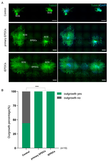 Mesenchymal iEPDCs promote neurite outgrowth of sympathetic ganglia. (A). Representative immunofluorescence images (Tubb3 staining) of embryonic superior cervical ganglia (SCG) outgrowth after six-day culture alone or together with primary human EPDCs or iEPDCs in a 3D culture setup. Upper panel: No or hardly any neurite outgrowth is observed when SCG are cultured without EPDCs. Co-culture with primary human EPDCs (PD8, middle panel) or iEPDCs (PD30, lower panel) promotes neurite outgrowth from SCG. (B). Quantification of the percentage of SCGs showing neurite outgrowth when cultured alone or co-cultured with primary human EPDCs or iEPDCs. Scale bar = 500 µm. *** p < 0.001.
