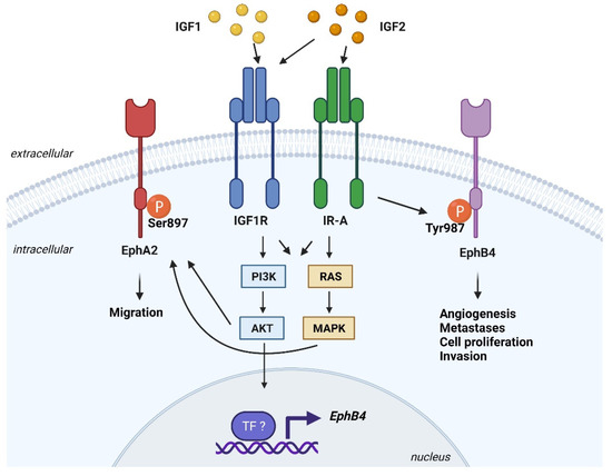 Functional interactions between the IGF and the Eph axis have been demonstrated in tumor cells. In preclinical breast cancer models, the IGF1/IGF1R/Akt axis sustained mRNA expression of EphB4, thereby promoting cell proliferation and migration responses, which were sentitive to the PI3K inhibitor LY294002 [209]. In malignant mesothelioma cells, upon autocrine IGF2 stimulation, IR-A phosphorylates EphB4 at tyrosine 987, thus maintaining EphB4 steady-state levels [47]. Accordingly, neutralization of the IR-A/IGF2 loop using anti-IGF2 antibodies determined EphB4 dephosphorylation and increased receptor ubiquitination and degradation [46,47]. An interesting crosstalk has been described between the PI3K/Akt pathway and EphA2 in tumor cells [210]. Upon growth factor/growth factor receptor activation, Akt phosphorylates EphA2 on serine 897, promoting cell migration in a ligand-independent manner. Of note, stimulation with EphrinA1 leads to dephosphorylation of EphA2 on Ser897 and inhibition of migration [210]. Overall, these results suggest a putative role of the IGF1R in the regulation of the Akt/EphA2 axis, although this hypothesis remains speculative at the moment.