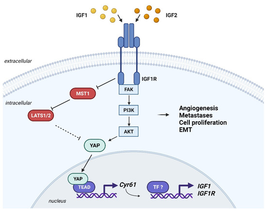 Schematic representation of the functional interaction between the IGF system and the Hippo pathway in cancer. IGF1R might contribute to regulating the Hippo pathway favoring YAP expression and translocation into the nucleus. The IGF1/IGF1R/FAK/Akt/YAP signaling cascade, which promotes YAP nuclear accumulation and expression of its canonical targets, including Cyr61, is depicted. Conversely, the IGF1R inhibits MST1 expression and the downstream kinase LATS1/2 thereby blocking LATS1/2-driven YAP phosphorylation and degradation. Cyr61 drives mRNA expression of IGF1 and IGF1R but the mechanisms are still poorly defined. Biological responses evoked by the IGF/Hippo pathway in cancer are reported.