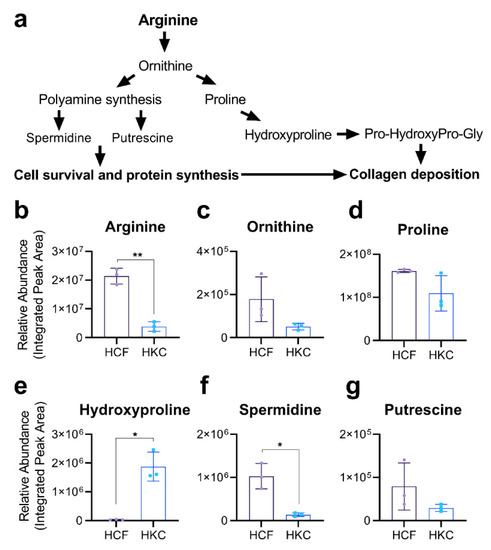 Figure 2. Arginine-related metabolite levels in HCFs and HKCs. (a) General schematic of arginine metabolism showing conversion of arginine to ornithine leading to either polyamine synthesis or generation of proline and hydroxyproline. (bg) Metabolomics analysis of cytosolic levels of arginine-related metabolites (arginine and ornithine), collagen-related metabolites (proline and hydroxyproline), and polyamines (spermidine and putrescine) in 3D constructs of HCFs and HKCs. An unpaired, nonparametric t-test with Welch’s corrections was used to determine statistical significance with * p < 0.05 and ** p < 0.01 based on n = 3. Error bars represent standard deviation.