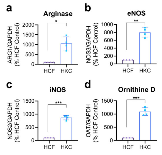 Figure 3. Gene expression patterns of arginine-related enzymes in HCFs and HKCs. Relative transcript levels of (a) arginase, (b) eNOS, (c) iNOS, and (d) ornithine D assessed by RT-PCR. Values shown as normalized to the housekeeping gene (GAPDH) and relative to HCF control levels. Statistical significance assessed using an unpaired, nonparametric t-test with Welch’s corrections with * p < 0.05, ** p < 0.01, and *** p < 0.001 based on n = 4. Error bars represent standard deviation.