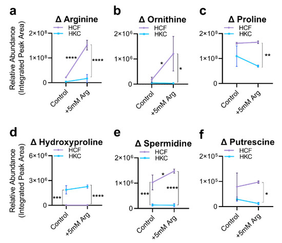 Figure 4. Arginine uptake and change in steady-state levels of arginine-related metabolites in HCFs and HKCs following arginine supplementation (5 mM). Relative abundance of (a) arginine, (b) ornithine, (c) proline, (d) hydroxyproline, (e) spermidine, and (f) putrescine in control and arginine supplemented (5 mM) constructs. Baseline control levels for these metabolites are also shown in Figure 2. Statistical significance assessed using a two-way ANOVA with Sidak’s multiple comparisons and * p < 0.05, ** p < 0.01, *** p < 0.001, and **** p < 0.0001 based on n = 3. Error bars represent standard deviation.