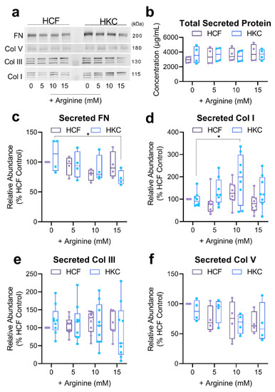 Since KC is associated with thinning of the stromal ECM, we sought to determine if arginine supplementation was a viable option for promoting favorable ECM deposition by HKCs. We measured fibronectin, and collagen types I, III, and V secretion in conditioned media analyzed by Western blot following supplementation with increasing concentration of arginine (5, 10, and 15 mM) (Figure 5a and Figure S4). As fibronectin and collagen are very distinct in terms of amino acid composition and structure [5,32], we sought to determine whether arginine supplementation influenced all ECM protein secretion indiscriminately or exhibited possible specificity for collagen expression. Arginine supplementation did not significantly modulate total secreted protein levels found in the culture medium of HCFs or HKCs (Figure 5b). Interestingly, high arginine concentrations of 15 mM significantly reduced fibronectin secretion (1.5-fold, p = 0.037) in HKCs with slight reductions in HCFs at 10 mM arginine supplementation (Figure 5c). Arginine supplementation (10 mM) also led to increased collagen type I secretion by 1.94-fold (p = 0.019) in HKC with no significant modulation in collagen type III or V secretion in HCFs or HKCs (Figure 5d–f). These results suggest that arginine supplementation favors collagen type I secretion over the other major isoforms (types III and V) expressed by human corneal fibroblasts.
