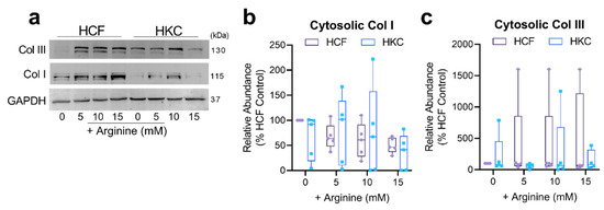 To determine if cytosolic levels of collagen type I and III were modulated by excess arginine, we probed cytoplasmic fractions of HCF and HKC constructs. In agreement with the effects of arginine supplementation on collagen secretion, cytosolic collagen type I showed an elevated trend in HKCs following 10 mM arginine supplementation with no significant differences in collagen type III protein expression in either HCFs or HKCs (Figure 6 and Figure S5). These results suggest that arginine supplementation may promote collagen expression by corneal fibroblast in vitro.