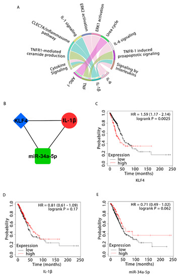 Identification of NSCLC-specific DEGs, DEMs, pathway enrichment analysis, 3-node miRNA FFL and OS analyses. (A) Chord plot showing the association of top 10 significant pathways and 4 DEGs involved in them. The outer circle indicates top 10 significant pathways (on the top semicircle) and 4 DEGs (on the bottom semicircle). Each DEG has a unique colored band and colored edge inside the circle represents relationship of a particular DEG with respective connected pathway(s); (B) Higher-order network motif consisting of one miRNA (miR-34a-5p) as green rectangular node, one gene (IL-1β) as red circular node, and one TF (KLF4) as blue diamond node along with their relative regulatory interactions. Kaplan–Meier survival curves showing the prognostic values of (C) KLF4; (D) IL-1β; and (E) miR-34a-5p expression levels across TCGA-LUAD cohort. The high and low expression curves are signified by red and black colors, respectively. HR = Hazard Ratio.