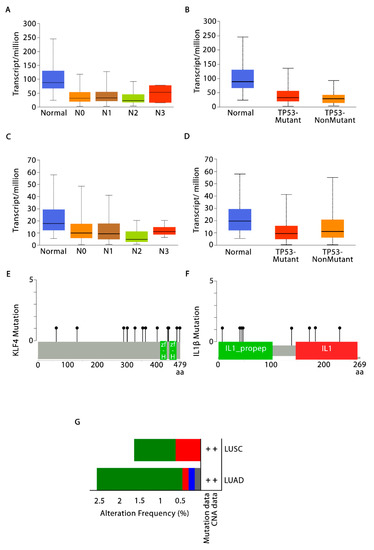 Validation of KLF4 and IL-1β using UALCAN and cBioPortal. Box-and-whisker plots displaying KLF4 expression levels in TCGA-LUSC cohort based on (A) nodal metastasis statuses; and (B) TP53 mutation via UALCAN database; (C) box-and-whisker plots showing levels of IL-1β expression in TCGA-LUSC cohort based on nodal metastasis statuses; and (D) TP53 mutation. Lollipop plots displaying 12 and 8 nonsynonymous mutations in (E) KLF4 and (F) IL-1β protein domains. The grey-colored horizontal bar represents the whole length of KLF4 and IL-1β proteins with the number of amino acids being displayed below the grey bar. Protein domains were showed by the red-and green-colored boxes. The locations and frequencies of mutations were denoted by the solid vertical lines and lollipop-like dots at their ends, respectively. (G) Barplots showing the alteration frequency of KLF4 and IL-1β across TCGA-NSCLC cohort (2.58% of 660 LUAD cases and 1.65% of 484 LUSC cases). Green, red, blue, and grey colored bars depicts missense mutations (2.12% in LUAD and 1.03% in LUSC), amplification (0.15% in LUAD and 0.62% in LUSC), deep deletion (0.15% in LUAD), and truncating mutation (0.15% in LUAD), respectively.