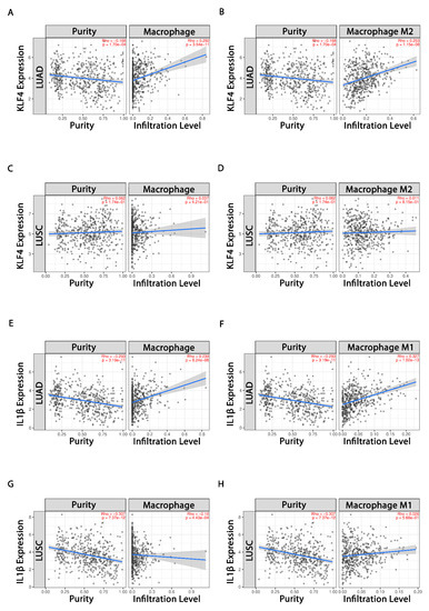 TIMER web-based tool (http://timer.cistrome.org/, accessed on 3 April 2021) [50] was queried to explore the interconnection between tumor-infiltrating immune cells in TCGA-LUAD and LUSC patients and expression levels of KLF4 and IL-1β. Spearman’s test was used and p-value was regarded as the statistically significant threshold.