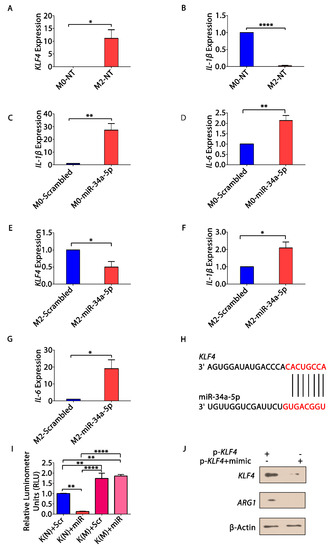 Association of KLF4, IL-1β and miR-34a-5p in macrophage polarization. Relative fold change in expression of (A) KLF4 and (B) IL-1β in M0 (unstimulated) and M2 (IL4 stimulated) macrophages, as determined by qRT-PCR; relative fold change in expression of (C) IL-1β and (D) IL-6 upon transfection of miR-34a-5p in M0 macrophages; relative fold change in expression of (E) KLF4; (F) IL-1β; and (G) IL-6 upon transfection of miR-34a-5p in M2 macrophages, determined by qRT-PCR; (H) position 25-32 region on KLF4 3′UTR showing conserved 8-mer binding site of miR-34a-5p (obtained from TargetScan); (I) dual-luciferase reporter assay—plasmid containing 3′UTR of KLF4 K(N) and mutated 3′ UTR of KLF4 K(M) were co-transfected with scrambled (Scr), miR-34a-5p mimic and pRL-vector containing Renilla luciferase gene, respectively, in A549 cells, and luminescence was measured. Measurements were expressed as relative luminometer units and normalized by the luminescence of Renilla luciferase; (J) THP-1 cells were transfected with KLF4 overexpression plasmid and miR-mimic. Total proteins were extracted and evaluated for degradation of KLF4 and ARG1 by Western blotting. β-actin was used as an endogenous control. * p < 0.05, ** p < 0.01, **** p < 0.0001.