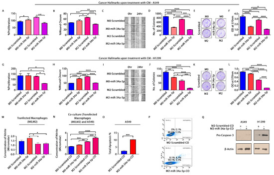 Macrophage polarization affects cancer hallmarks. Transfected M0 and M2 macrophages were co-cultured with A549 cells. CM was collected and used to check cancer hallmarks on A549 and H1299 cells. (A). Cellular proliferation—graph showing % proliferation of A549 cells, determined by MTT Assay; (B,C). % wound closure of the scratch created in monolayer and photographic images of scratches at different time intervals (0 h, 24 h); (D–F). Colony counts photographic images showing colonies and spectrophotometric determination of clonogenic capacity of A549 cells upon treatment with co-culture CM of scrambled and miR-34a-5p transfected THP-1 (both M0 and M2) and A549 cells; (G). Graph showing % proliferation of H1299 cells; (H,I). % Wound closure of the scratch created in monolayer and photographic images of scratches at different time intervals (0 h, 24 h); (J–L). Colony counts, photographic images showing colonies, and spectrophotometric determination of clonogenic capacity of H1299 cells upon treatment with same CM. * p <0.05, ** p < 0.01, *** p < 0.001, **** p < 0.0001. (M). Nitrite content when M0 and M2 macrophages were transfected with scrambled and miR–mimics, respectively; (N). Nitrite content upon co-culture of transfected macrophages with A549 cells, as deter. * p < 0.05, ** p < 0.01, *** p < 0.001,**** p < 0.0001; (O,P). Flow cytometric measurement of apoptosis in A549 cells using Annexin V—FITC. CM from co-culture of M2 transfected with scrambled and miR-mimics, respectively, with A549 cells was used to treat A549 and H1299 cells for 48 h. Cells were stained with Annexin–V/FITC and PI, fluorescence of A549 cells was measured using FACS and; (Q). Western blotting. CM treated A549 and H1299 cells were lysed, total protein was extracted in RIPA extraction buffer and expression of Procaspase-3 was detected using Western blotting. Protein expression was normalized by expression of β-actin, an endogenous control. * p < 0.05, ** p < 0.01. Three independent experiments were performed (N = 3). M0-scrambled—unstimulated THP-1 cells transfected with scrambled, M2-scrambled—IL-4 stimulated THP-1 cells transfected with scrambled, M0-miR-34a-5p—unstimulated THP-1 cells transfected with miR mimic, M2-miR-34a-5p-IL4 stimulated THP-1 cells transfected with miR mimic.
