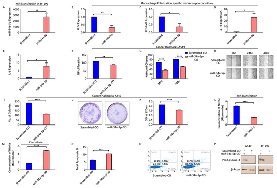 To decipher the functional significance of KLF4 in progression of NSCLC, we overexpressed H1299 cells with control (scrambled) and miR-34a-5p. The effect of transfection on expression of KLF4 and its regulated genes—IL-6 and IL-1β was checked semi quantitatively (Supplementary Figure S7). The transfected cells were co-cultured with IL-4 stimulated THP-1 cells. A significant increase in the relative expression of miR-34a-5p was observed upon transfection (Figure 7A). We observed a significant reduction in expression of M2 specific markers—KLF4 (Figure 7B) and REL-1MB (Figure 7C), with a compelling increase in expression of M1 specific markers—IL-1β (Figure 7D) and IL-6 (Figure 7E) upon co-culture. Further, co-culture CM was used to treat A549 cells and analyze the cancer hallmarks. Cellular proliferation, wound healing potential and clonogenic capacity of NSCLC cells was markedly decreased in cells treated with co-culture CM from miR-transfected cells (Figure 7F–K). Moreover, the concentration of nitrites in H1299cells was reduced upon miR-34a-5p transfection (Figure 7L), but was significantly increased upon co-culture (Figure 7M). An increase in apoptosis of A549 cells (Figure 7N,O) and protein levels of pro-caspase3 upon treatment with co-culture CM was also observed (Figure 7P).