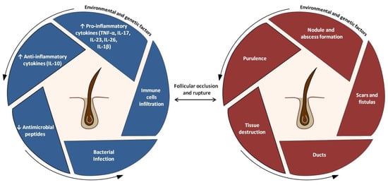 - Kelly, G.; Prens, E.P. Inflammatory Mechanisms in Hidradenitis Suppurativa. Dermatol. Clin. 2016, 34, 51–58. [Google Scholar] [CrossRef] [PubMed]