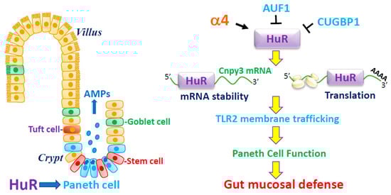 - Xiao, L.; Li, X.X.; Chung, H.K.; Kalakonda, S.; Cai, J.Z.; Cao, S.; Chen, N.; Liu, Y.; Rao, J.N.; Wang, H.Y.; et al. RNA-binding protein HuR regulates Paneth cell function by altering membrane localization of TLR2 via post-transcriptional control of CNPY3. Gastroenterology 2019, 157, 731–743. [Google Scholar] [CrossRef] [PubMed]