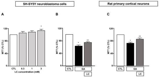 We first determined the effect of 24 h of exposure to LC at concentrations ranging from 0.3 to 3 mM on SH-SY5Y neuroblastoma cells. As shown in Figure 1A, we found that under the control conditions, mitochondrial activity was significantly increased when SH-SY5Y cells were exposed to LC at a concentration of 3 mM for 24 h. Therefore, we chose to use 3 mM LC for subsequent studies. The exposure of SH-SY5Y cells to GA resulted in a significant decrease in cell viability, in line with previous findings [15,36]. A pretreatment for 1 h with 3 mM LC significantly increased the cell viability in cells challenged with GA for 24 h (without LC removal, see the “Material and Methods” for further details). This effect was observed in both SH-SY5Y cells and in rat primary cortical neurons (Figure 1B,C).