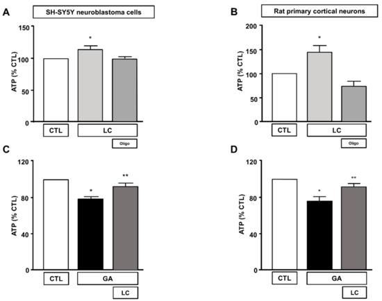 Effect of LC on intracellular ATP levels in SH-SY5Y neuroblastoma cells and in rat primary cortical neurons. Effect on intracellular ATP levels of 1 h exposure to LC under control conditions in SH-SY5Y neuroblastoma cells (A), and in rat primary cortical neurons (B) in the presence or in the absence of oligomycin (3 µg/mL). Effect of LC on intracellular ATP levels in SH-SY5Y neuroblastoma cells (C) and in rat primary cortical neurons (D) both challenged with GA. Cells were pretreated with LC (3 mM) for 1 h, and then exposed to GA (1 mM) for 24 h (without removing LC). In each experiment, ATP levels were expressed as a percentage of the control. Statistical differences were assessed by one-way ANOVA followed by Dunnett’s post hoc test. (A) F (3, 20) = 5.232. Each column represents the mean ± S.E.M. of n = 6 experiments performed in triplicate. * Significant versus all groups (p < 0.05). (B) F (3, 36) = 14.28. Each column represents the mean ± S.E.M. of n = 10 experiments performed in duplicate. * Significant versus all groups (p < 0.01 versus CTL, p < 0.0001 versus LC+oligo). (C) F (2, 15) = 20.44. Each column represents the mean ± S.E.M. of n = 6 experiments performed in triplicate. * Significant versus all groups (p < 0.0001 versus CTL, p < 0.01 versus LC + GA); ** significant versus GA (p < 0.01). (D) F (2, 18) = 10.36. Each column represents the mean ± S.E.M. of n = 7 experiments performed in triplicate. * Significant versus all groups (p < 0.01 versus CTL, p < 0.05 versus LC + GA); ** significant versus GA and CTL (p < 0.05). Oligo = Oligomycin 3 µg/mL.
