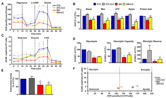 To elucidate the mechanisms underlying LC protection, we investigated the ability of this compound to affect overall cell metabolism on the background of GA challenged cells. We first analyzed ATP production. We explored the effect of LC on the intracellular ATP levels in SH-SY5Y cells and rat primary cortical neurons after 1 h of LC exposure under the control conditions. In this experimental setting, we found that LC exposure induced a significant increase in the intracellular ATP content (Figure 2A,B). Interestingly, LC-induced ATP generation completely relied on the oxidative phosphorylation process, since, in the presence of the ATP synthase inhibitor oligomycin (3 µg/mL) [15,40,42], ATP production was completely abolished (Figure 2A,B). When cells were pretreated with LC for 1 h and then exposed to GA for 24 h (without removing LC), the decrease in the ATP levels induced by the GA challenge was significantly blunted. This effect was observed in both SH-SY5Y cells and in rat primary cortical neurons (Figure 2C,D). Oligomycin did not significantly alter ATP production under the control conditions (data not shown). Considering the significant impact of GA on cell metabolism and ATP intracellular levels, we sought to further explore the effect of GA on energy management, by dissecting out its effect on glycolysis, measured as the extracellular acidification rate (ECAR), the L-lactate level secreted by cells, and mitochondrial respiration, assessed as the oxygen consumption rate (OCR). As reported in Figure 3, we found that in rat primary cortical neurons mitochondrial respiration (Figure 3A,B) and glycolysis (Figure 3C,D) were both significantly affected by the GA challenge. We observed that, in cells pretreated with LC and exposed to GA, LC positively affected mitochondrial respiration both under control conditions and in the presence of GA (Figure 3A,B). As shown in Figure 3B, on the one hand, LC rescued all the OCR parameters, including ATP (as previously observed, Figure 2D), on the other hand, LC did not show any significant effect on glycolysis and glycolysis reserves, but it significantly increased the glycolysis capacity (Figure 3D). As for glycolysis, the same result was obtained by measuring the L-lactate level (Figure 3E). Finally, the analysis of the cell energy phenotype showed that LC shifted the GA quiescent phenotype toward an aerobic phenotype, thereby increasing metabolic potential (Figure 3F).